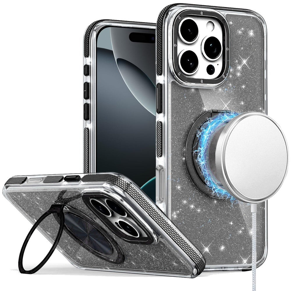 iPhone 16 Pro Max 6.9 inch Glitz HQ Shimmer Glitter [Magnetic Ring Circle] with 360 degree Rotational Ring Kickstand Tough Hybrid Case - Black