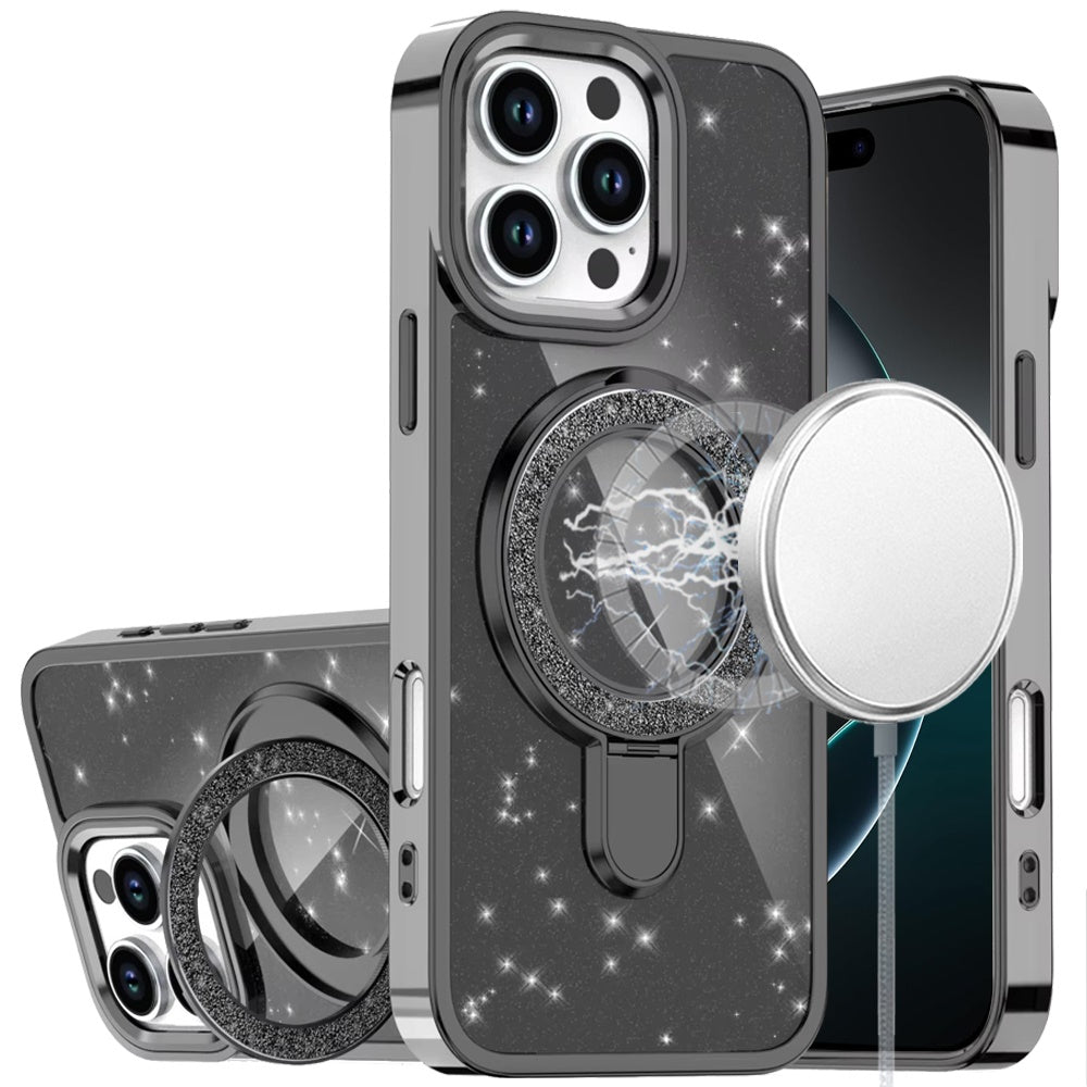 iPhone 16 Pro Max 6.9 Transparent Glitter Rotaional Magnetic Ring Stand HQ Hybrid - Black